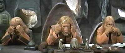 The President bangs the gavel and adjourns the hearing. The orangutans leave the room, the gorilla guards drag the subdued Taylor out, leaving Zira and Cornelius alone in the courtroom to ponder their fates.