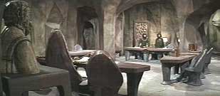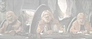 Everyone stands as three wizened old orangutans, apparently authority figures, enter the room, and take their places at a long table facing everyone else...
