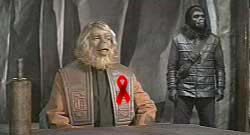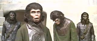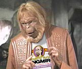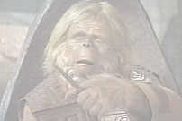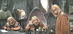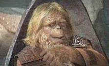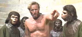 El Presidente': DAMN! OK, hang on a minute... (rubbing eyes)... wow, that was something. OK... where was I? Oh, yes... you may proceed, Dr. Homorius. Cornelius: By your lead, Mr. El Presidente', this tribunal has not yet defined the purpose for this inquiry. Dr. Minimus: You ask for the opportunity to present your case. Surely, you must know why you're here. Zira: At the very least, this man has the right to know whether there's a charge against him. Dr. Homorius: Objection, (singing out) ob-j e c t- i o n! This exhibit is indeed a man, therefore he has no rights under Ape law. El Presidente': And Dr. Zira, this is a Man, is it not? Zira: He is unlike any man you have ever seen... as we hope to prove. Dr. Homorius: He's got the most yummy white thighs I've never seen. They look absolutely (singing out again) DE-LI-C I O U S!!!!