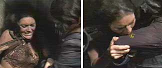 They open the cage door, remove Taylor and put a leather collar around his neck as he winces. Watching intently is Nova, clutching the bars of her cage. Julius whacks her across the face, knocking her down repeatedly to the floor, but she constantly springs back up immediately... mainly because she is too stupid to stay down and avoid a beating...