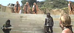 Everyone leaves the courtroom, hurriedly, and reassembles outside in the outdoor arena-like area. The orangutans stand at the top tier of the arena while Taylor, Zira, and Cornelius walk out onto the bottom level.