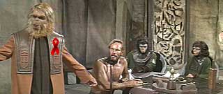 Dr. Homorius:: YEAH, OH YEAH...DADDY LIKES...!!! Taylor: Mmmppphh!!! Mshlphhh!!! El Presidente': That's enough! You go too far! Dr. Zaius: I think an indickment... I mean... an indictment is in order. Dr. Homorius: Yes sir. The state charges Dr. Zira and Cornelius with contempt of this tribunal, malicious mischief, and scientific heresy... not to mention indecent exposure. El Presidente': It's so ordered! This tribunal will examine all the evidence presented here, and in due course render its verdict. As to the proposed indictment... and as to the disposition of the deviate in question... this hearing is adjourned!