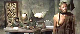 El Presidente': Answer the question, Dr. Zira! IS IT A MAN? Cornelius: Uh... sir, perhaps the question is the pointed issue. Is he a man, is he a deviate, or... a freak of nature? Dr. Homorius: Ob-jec-t i o n! El Presidente': Sustained. Now... Dr. Zira, in all fairness, you must admit that the accused is a non-Ape and therefore has no rights under Ape law. Zira: Then why is he called "the accused?" Your honors must think him guilty of something. Dr. Zaius: He is not being tried... he is being disposed of. It is scientific heresy that he is being tried here. Dr. Minimus: Well put, Dr. Zaius. Let us warn our friends that they endanger their own careers by defending this animal. Taylor: Then, I'll defend myself. El Presidente': Dr. Zira, would you tell... uh.. (looks at papers...) Bright Thighs to be quiet?