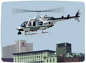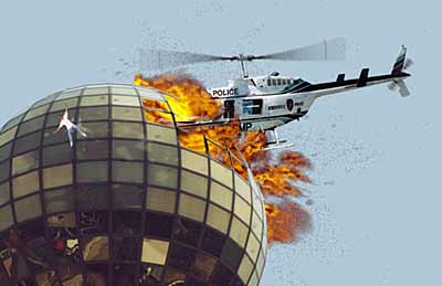 David Gregory: Katie, the police have dispatched a helicopter to the scene... it's nearing the Sunsphere... Katie: I don't think they do, Al. Al: Damn. Ask him if he can bring me back one of those t-shirts, size XXXL... David Gregory: The police helicopter is hovering near the top of the Sunsphere... we can hear a loudspeaker... yes, the police are demanding that Hamby surrender himself... Katie: David, can you bring Al back a t-shirt?... Al: Size XXXL... tell him.