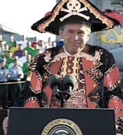 This looks like a campaign stunt, with us taxpayers footing the bill for this cowboy antic. Expect to see these images in his reelection campaign commercials next year. Update: 9:45 p.m.- Bush struts across the deck of the USS Abraham Lincoln aircraft carrier before the ship's numerous crew to a podium to make his address. It was an incredible over-the-top God-Bless-America setting that, yes, was undoubtedly a campaign commercial in the making, so obvious it was laughable. Bush even donned his special sea-farin' outfit for the occasion...